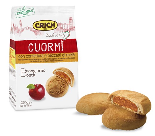 I Crich Frollini Cuor Mi sono biscotti frollini dal cuore morbido e dolce, arricchiti con confettura di mela e pezzetti di frutta.