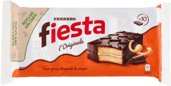 IL FERRERO FIESTA CLASSICA è UNA MERENDINA COMPOSTA DA UN SOFFICE PAN DI SPAGNA FARCITO CON UNA CREMA ALL’ARANCIA, RICOPERTA DA UNA GOLOSA GLASSA AL CACAO.