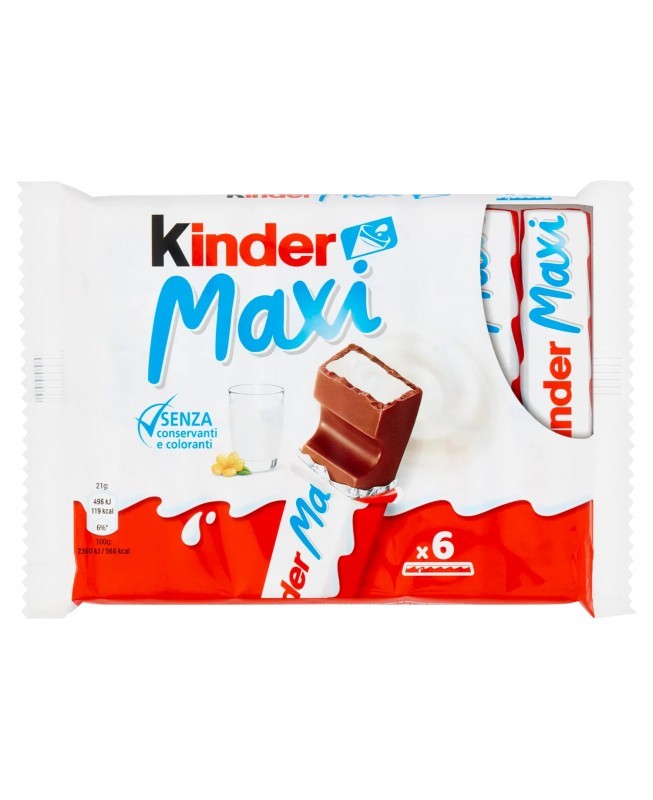 KINDER MAXI 6 PEZZI 126GR è UNA DELIZIOSA MERENDA AL CIOCCOLATO PENSATA PER CHI AMA IL GUSTO INCONFONDIBILE DEI PRODOTTI KINDER, MARCHIO DEL GRUPPO FERRERO.