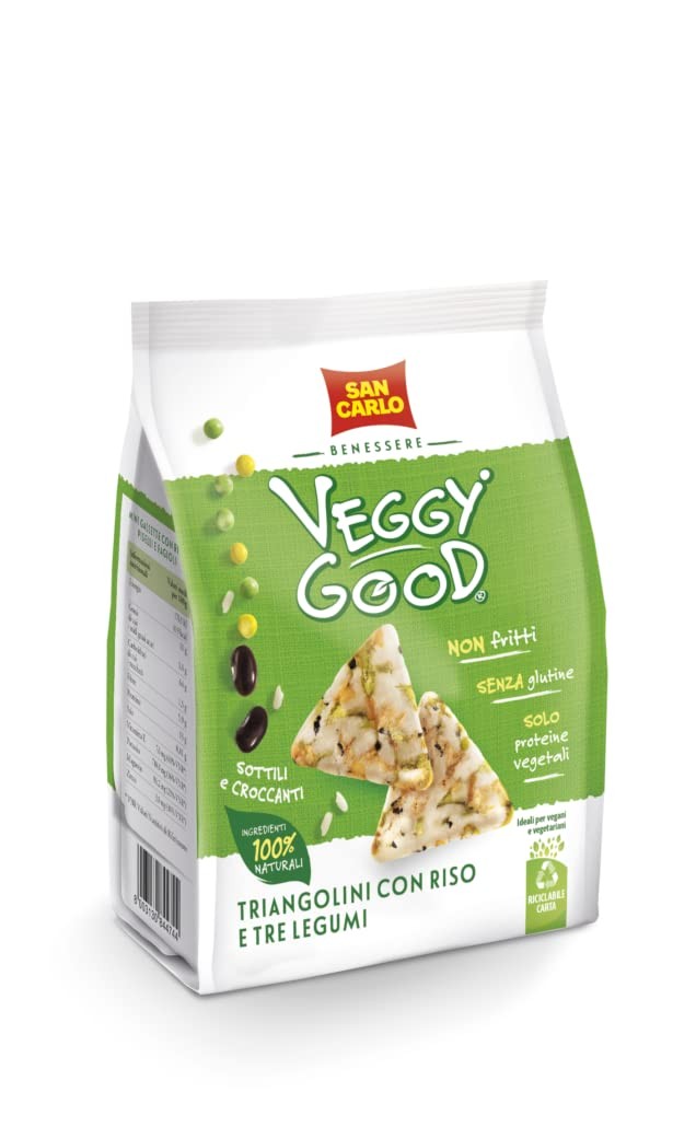 SAN CARLO VEGGYGOOD TRIANGOLINI CON RISO E TRE LEGUMI 65GR è uno snack croccante e completamente vegetale, pensato per chi cerca gusto, leggerezza e ingredienti naturali.