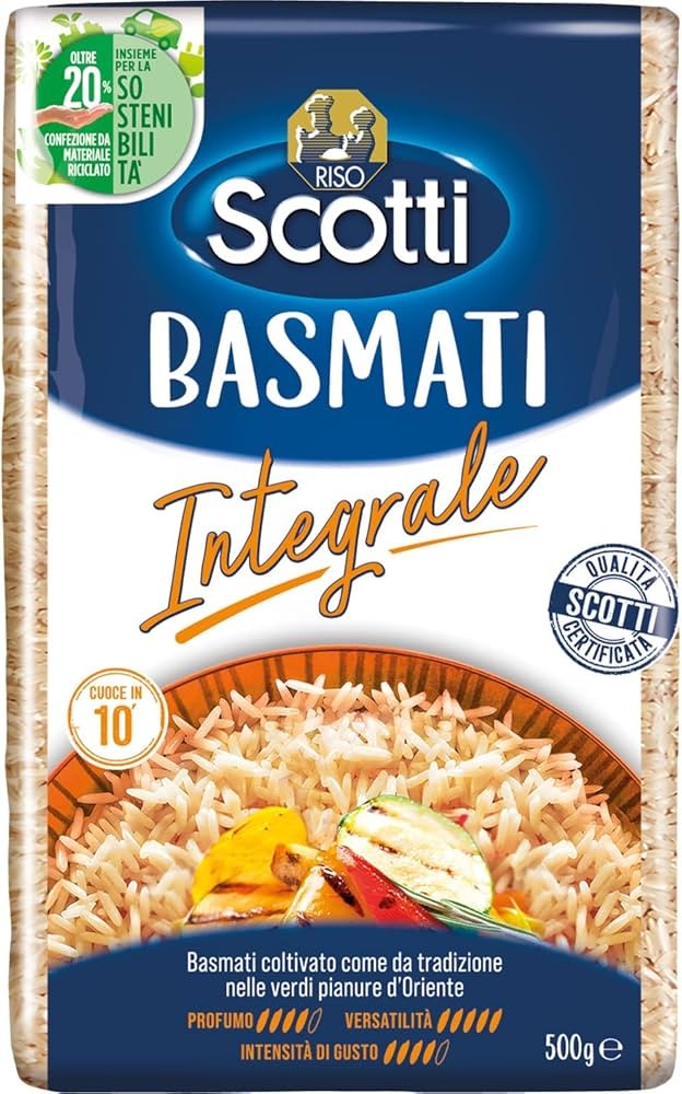 Il Riso Basmati Integrale della linea Scotti, confezione da 500 g, è un riso lungo tipo B «Basmati», nella variante integrale, ossia conservato con la crusca per preservare fibre, nutrienti e sapore più ricco.